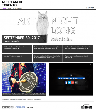 オフィスに来るメンバーさんは意外に知らない方が多いのですが、Nuit Blanche(発音はニュイ・ブランシュ、フランス語で白い夜という意味です)とは、現代アートフェスティバルの事。トロント以外の街でも開催されているのですが、特徴は夜どおし行われるということ。夜7時から翌朝の7時まで開催され、そして街中がその会場となるので、屋内だけでなく、ストリートや公園など、街中至る所に展示がされるのです![]()