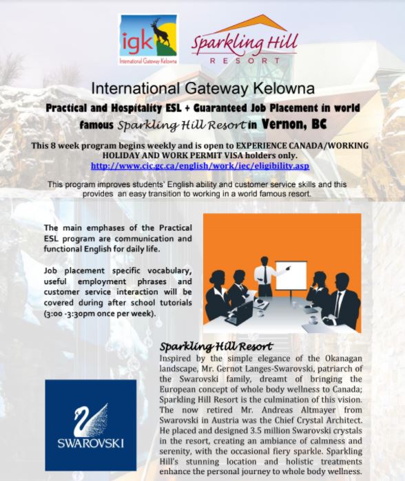 Practical and Hospitality ESL + Guaranteed Job Placement in world famous Sparkling Hill Resort