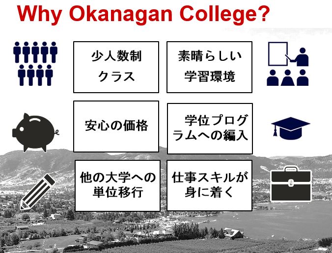 オカナガンカレッジは1965年にカナダ、ブリティッシュ・コロンビア州のケロウナに専門学校として創立された、学位コースおよび職業訓練コースを提供するカレッジとなります。少人数クラス制でキャリアに直結する専門プログラム、そしてブリティッシュ・コロンビア大学(UBC)およびビクトリア大学(UVIC)等々へ編入できる学士号コースの提供プログラムが人気です。英語を学ばれた方の為に付属の語学学校が有り、基礎英語から、カレッジ進学の為のアカデミック英語まで学ぶ事が出来ます。