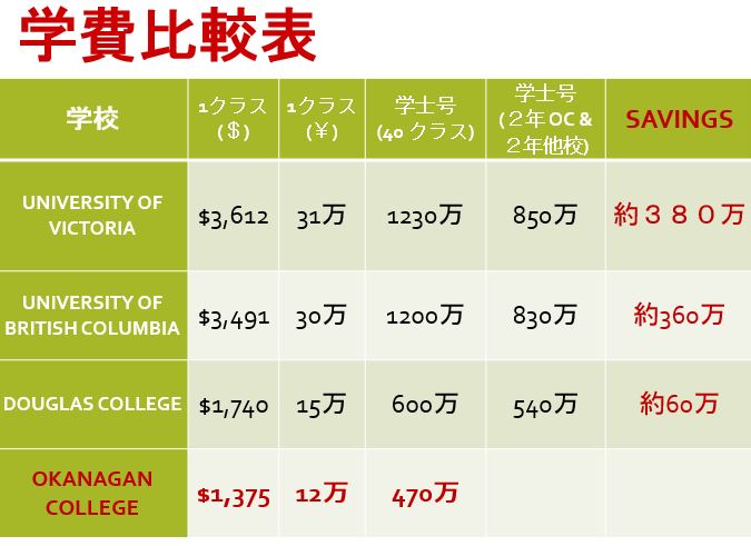 さらには学費も安いので留学費用を大分抑える事が出来ます。以下はオカナガンカレッジのマーケターの方が比較した学費の差となります。都市部の学校と比べて留学費用をいかに抑えられる事が出来るかが一目瞭然ですね。
