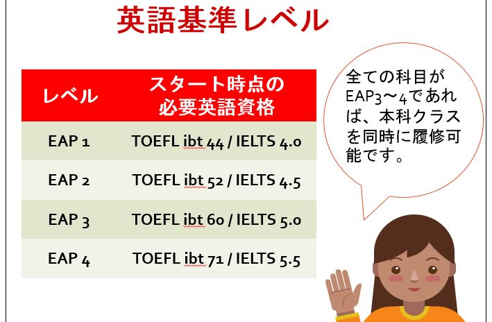 オカナガンカレッジの語学学校ではESL、EAPの英語プログラムを開講しています。ESLは初心者向けクラスでレベルは2段階、EAPレベルが4段階に分かれカレッジなどの進学を目指す中級、上級者向けのクラスとなります。EAP4レベルに達するとTOEFLやIELTSのスコアを提出する必要無く、カレッジ本科コースに進学する事ができます。(EAPレベル3の時点で本科の一部の授業の履修も可能となります。)