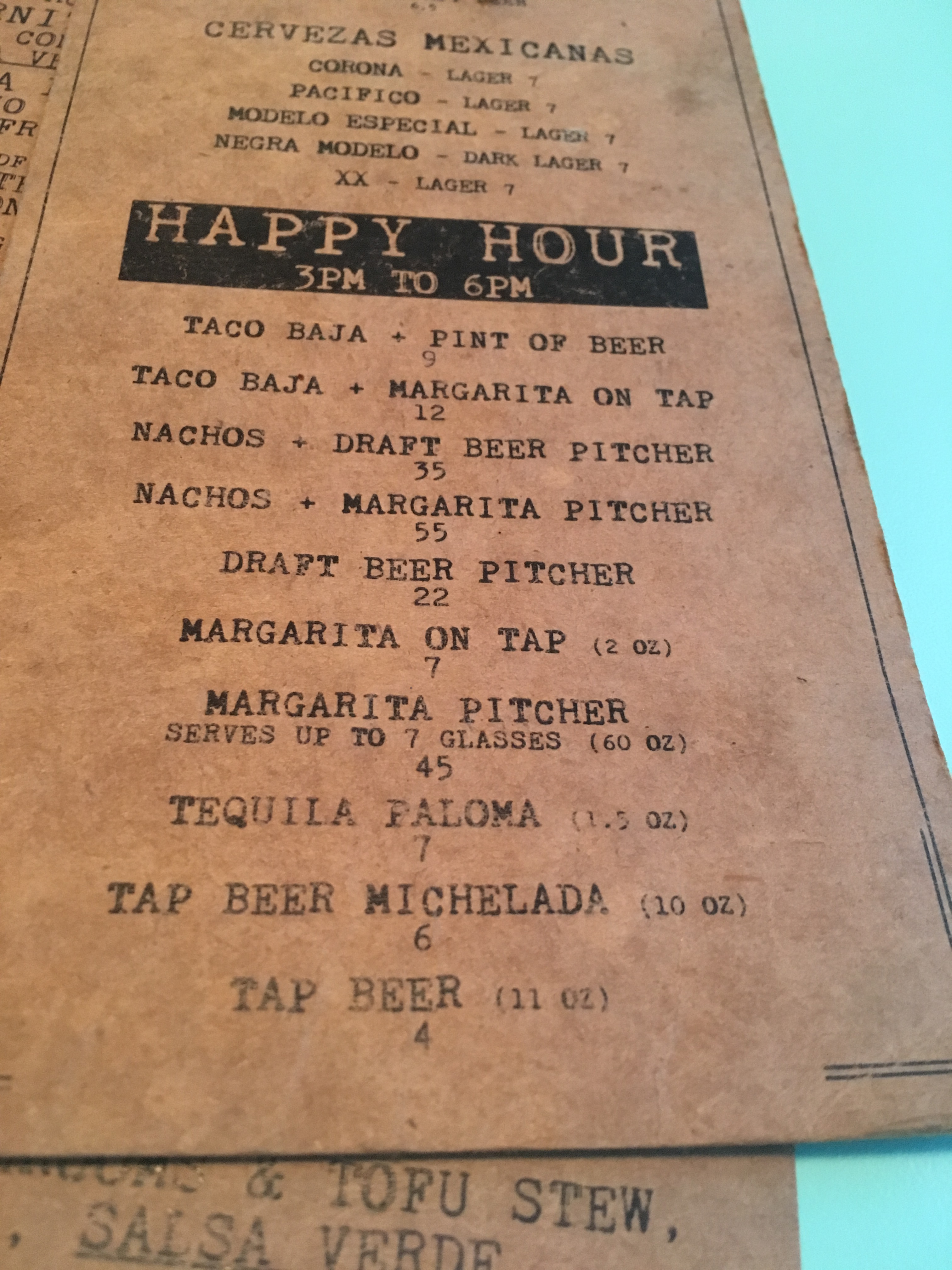 ハッピーアワーに頼むとなんてと$3.5(小さい4″タコス一つ分)お得です!