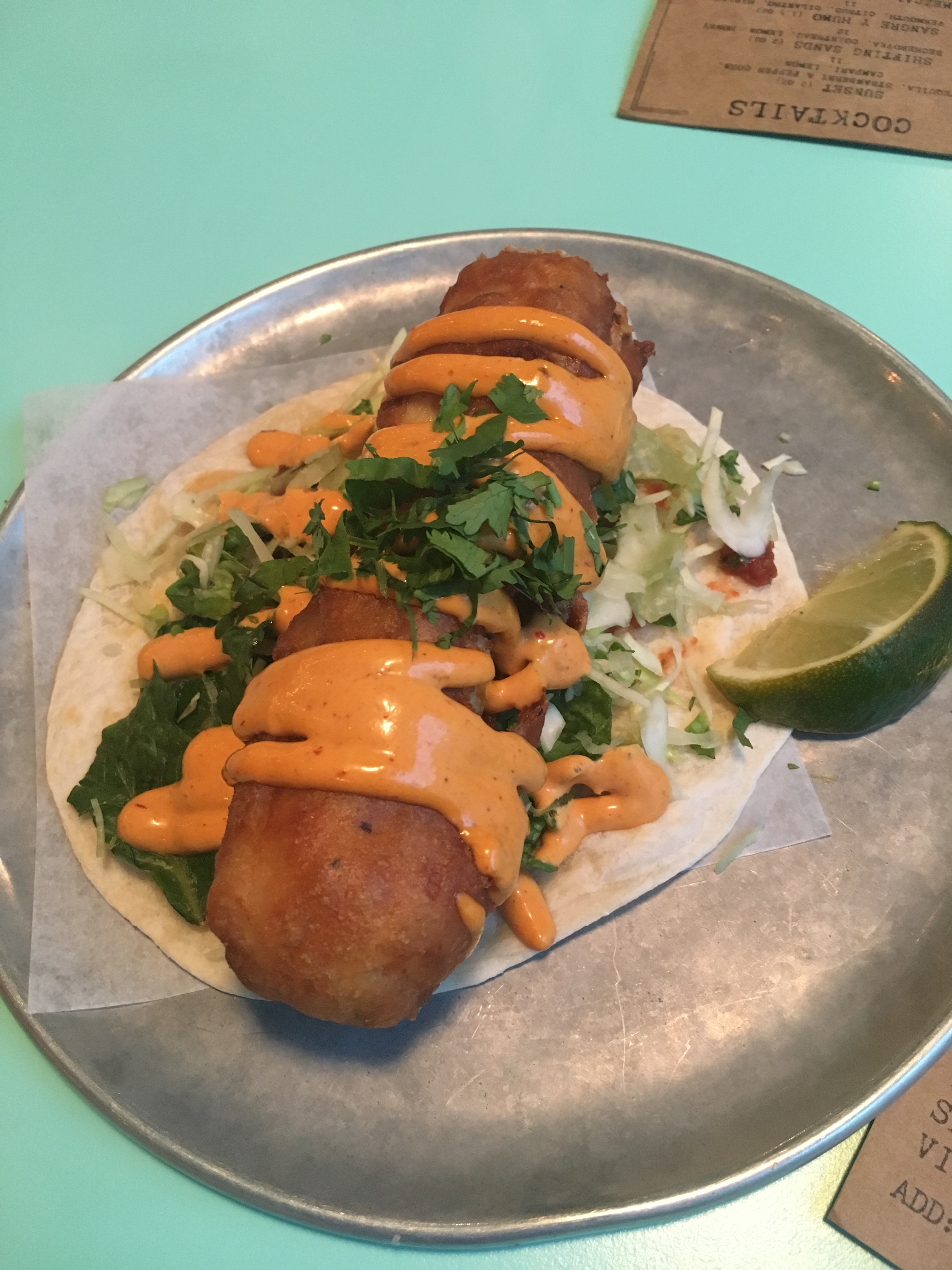 私はTaco Baja (6”の小麦粉のトルティーヤに季節の魚のフライがドーンとのったタコス)とパイントビールのセットを頼みました♪