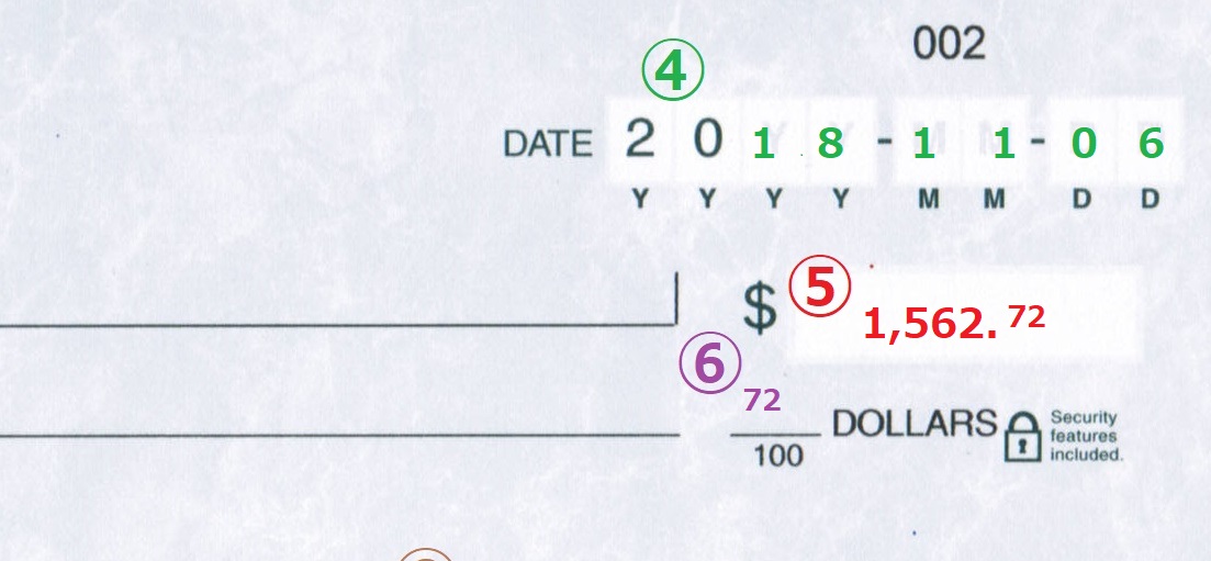 ⑥100の上の線上に③でスペルアウトした際に記載しなかった小数点以下の数字のみを記載します。(数字で)