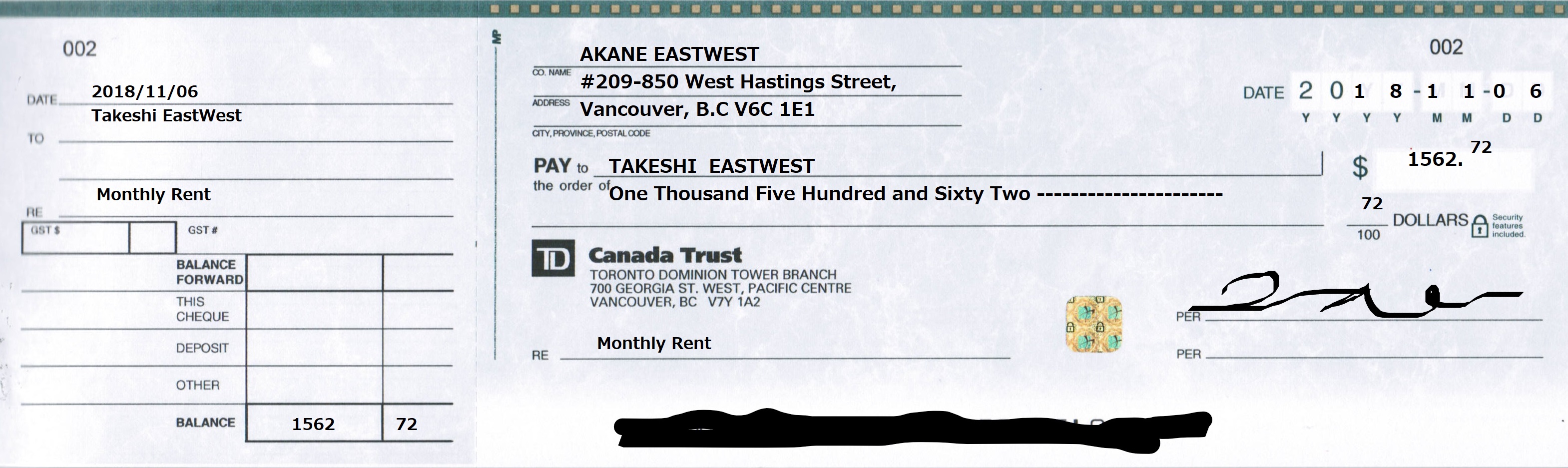 まず小切手(カナダでいうチェックChequeまたはCheck)とはどんな見た目かというと...