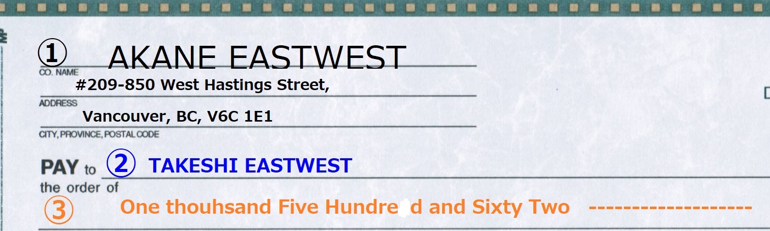 こちらには支払う額をスペルアウト(実際に英語で書き出し)して記載します。ただし、小数点以下は書き出しません。