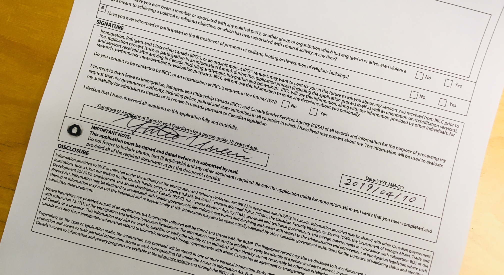 ワークパーミットアプリケーションは、全て記載した上で、プリントアウトしたフォームの5ページ目にパスポートと同様のサインを記入しましょう。