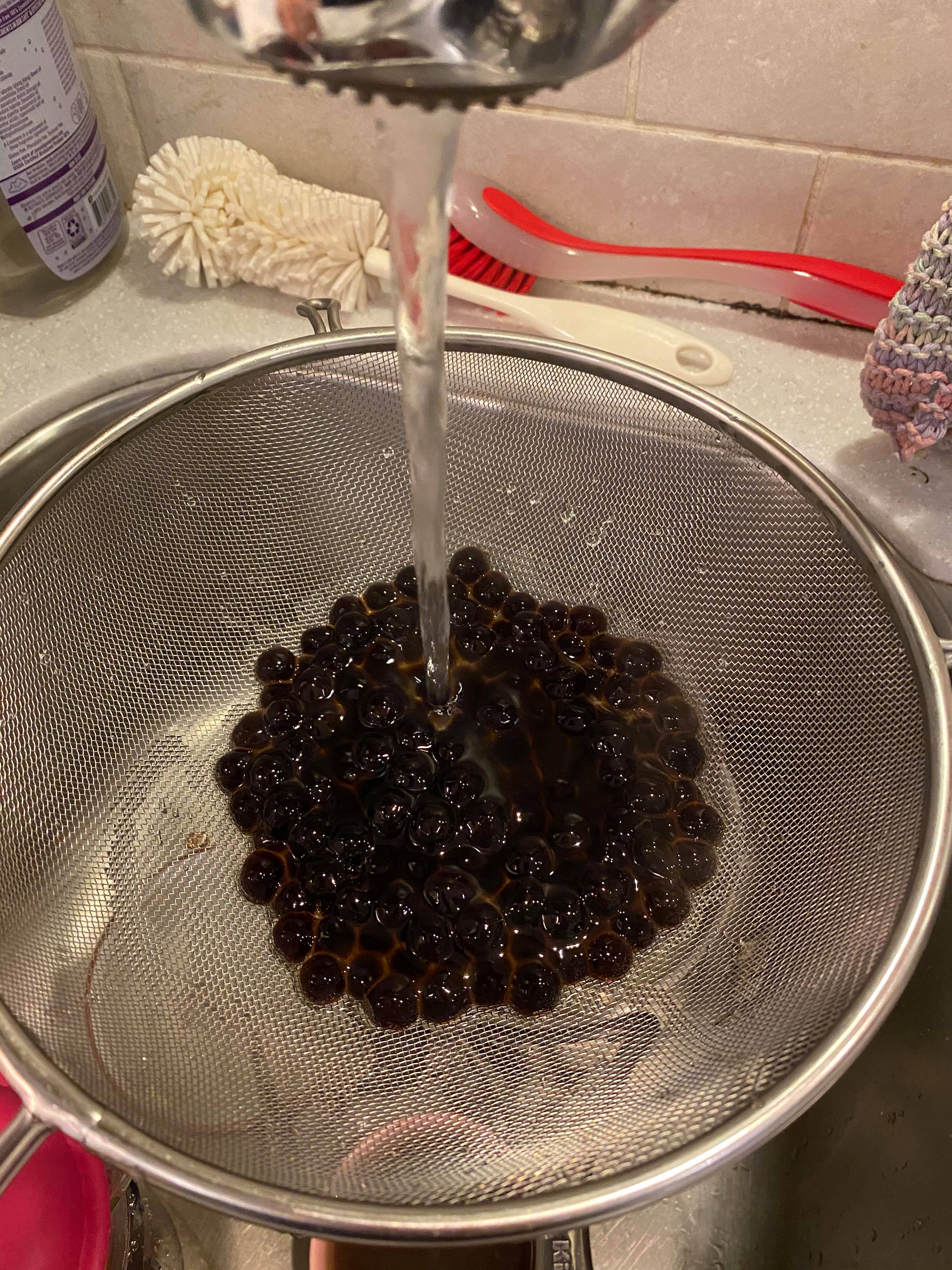 ゆであがったら今度は冷たいお水で洗い、パールの滑りを取る、そして熱くなってるので少し冷まします。ちょっとカエルの卵みたいで気持ちが悪い…
