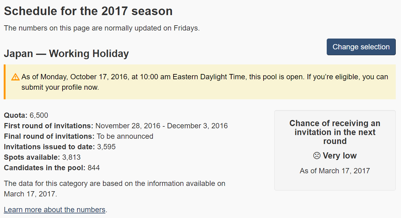 カナダ時間2017年3月17日にワーキングホリデー (Working Holiday)の募集定員に更新がありました。